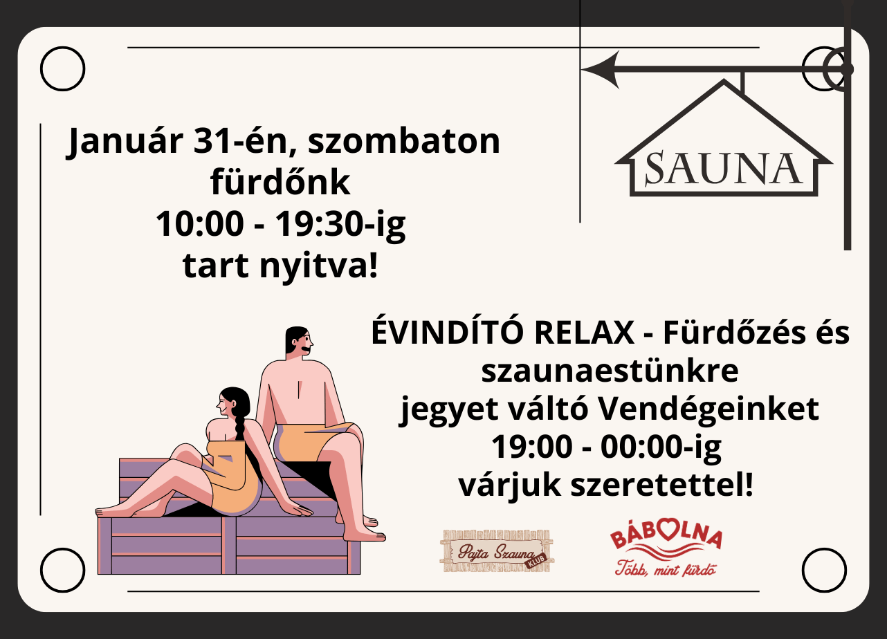 ÉVINDÍTÓ RELAX – Fürdőzés és szaunaest a Bábolna Fürdőben – január 31-én, szombaton Indítsd az újévet nyugalomban és feltöltődéssel! Merülj…